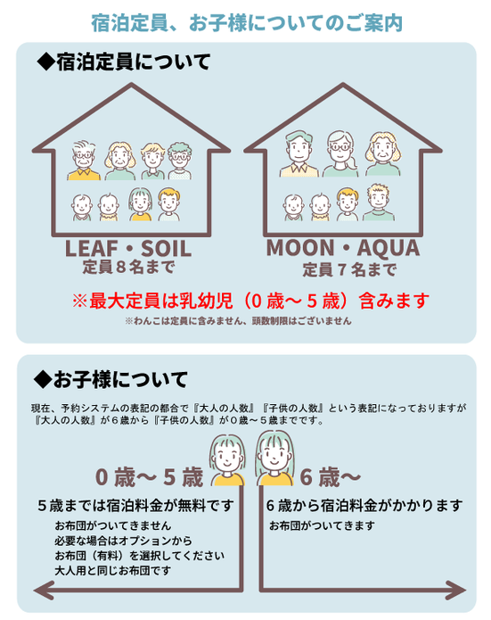 4)5歳以下の方の宿泊料金は無料ですが、寝具はございません。寝具をご希望の場合は、別途 寝具料金がかかります。その他共通料金へ→