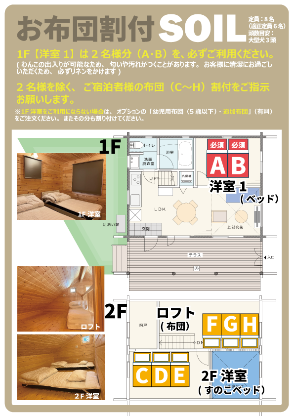 ・ 基本定員 : 2~8名(適正定員6名)、愛犬の頭数目安:大型犬3頭